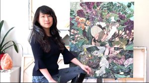 Lin’s exhibition features meticulously detailed acrylic paintings that celebrate native and common flora and wildlife and highlight the ecologies and habitats that support and connect them.