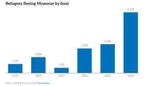 Despite the risks, increasing numbers of Rohingya are making similar journeys. Last year, more than 7,800 attempted to flee Myanmar by boat – an 80 per cent increase compared to 2023 – of which over 650 died or went missing. A further 700 have taken boats since the start of this year.